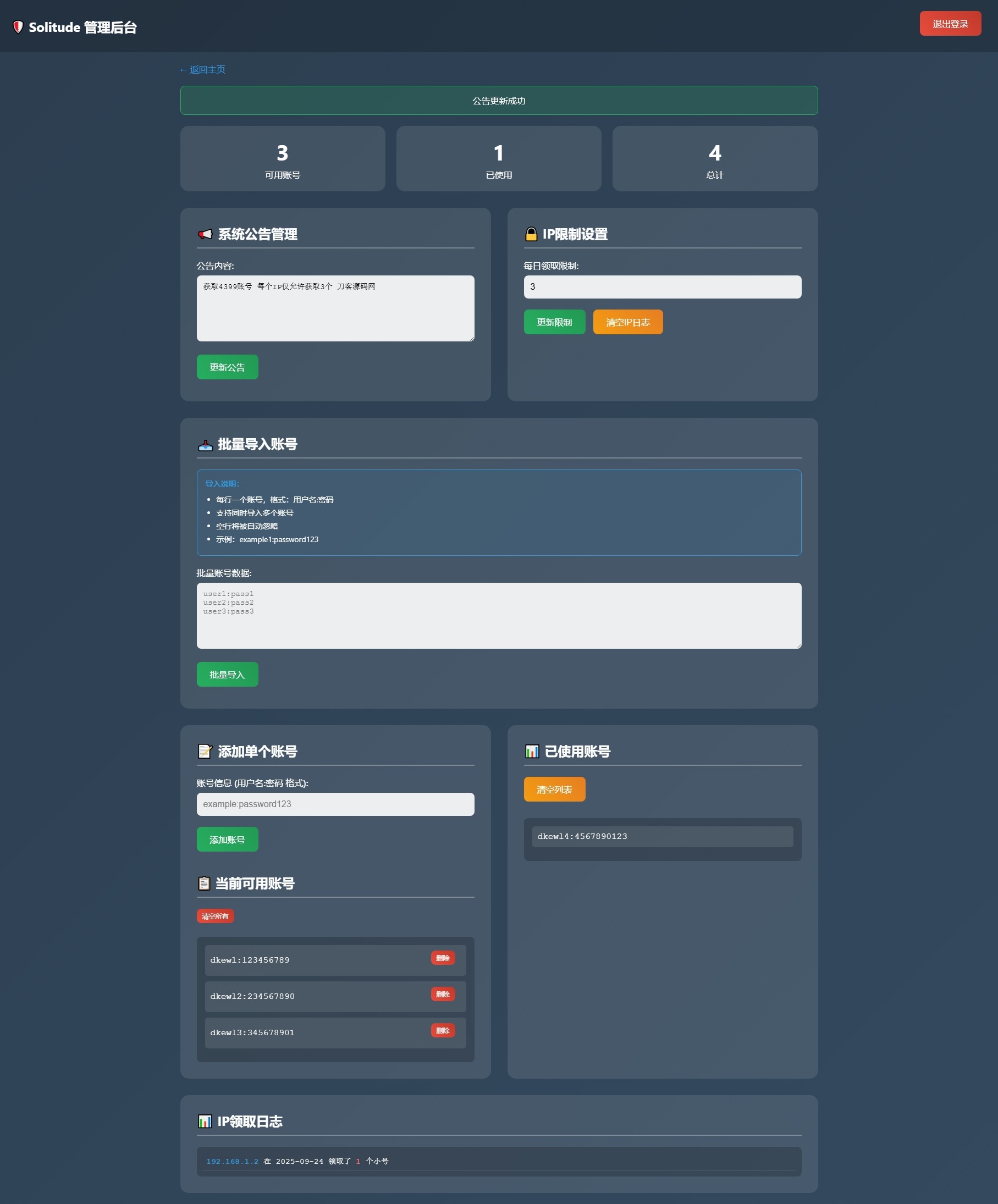 详情 评论 问答 小号分发 卡密分发系统网站源码 轻量化站长10天前更新关注私信0465小号分发 卡密分发系统网站源码 轻量化此内容为付费资源,请付费后查看¥3.5年费会员免费永久会员免费暂时无法购买,请与客服联系您当前未登录!建议登陆后购买,可保存购买订单付费资源已售 5 简介: 小号分发 卡密分发系统网站源码 轻量化 此为小号分发卡密系统源码,专用于分发小号库存账号或卡密等使用,不过规定每个IP仅能领取3次,也可视作小号分发工具。 已做过简易测试,感兴趣者可自行部署使用! 图片: © 版权声明文章版权归作者所有,未经允许请勿转载。THE END源码资源网站源码 喜欢就支持一下吧点赞5 分享QQ空间微博QQ好友海报分享复制链接收藏如何下载资源?您可以通过搜索或浏览分类列表来找到您期望下载的资源。随后点击资源介绍页右侧的下载链接按钮,依据提示信息进行操作即可。是否需要充值才能下载?大部分资源可积分免费下载,为了维持网站的运行小部分资源须付费才能下载。下载的资源是否有版权?本站提供的下载资源均为网络搜集,仅供个人学习和交流使用。对于版权问题,请用户自行判断并承担相应责任。