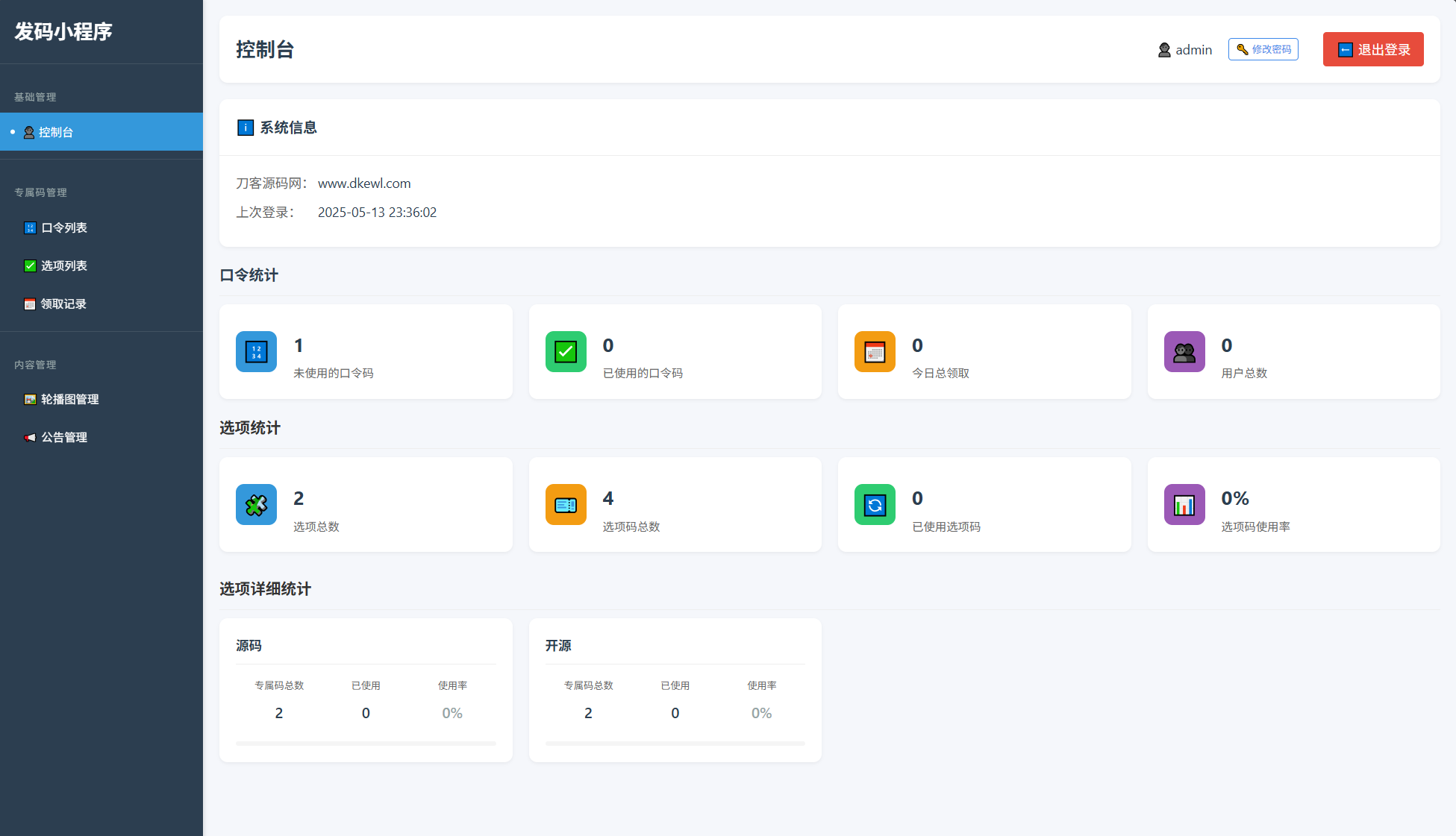 详情 评论 问答 自助发卡小程序系统/多种卡密领取模式/流量主站长9天前更新关注私信0555自助发卡小程序系统/多种卡密领取模式/流量主此内容为付费资源,请付费后查看¥3.5年费会员免费永久会员免费暂时无法购买,请与客服联系您当前未登录!建议登陆后购买,可保存购买订单付费资源已售 5 简介: 自助发卡小程序系统/多种卡密领取模式/流量主 支持:添加分类丨分类介绍丨导入卡密丨卡密使用说明 支持:直接领取丨观看广告领取 运行环境: PHP7.4 + MySQL5.7 图片: © 版权声明文章版权归作者所有,未经允许请勿转载。THE END小程序源码源码资源 喜欢就支持一下吧点赞5 分享QQ空间微博QQ好友海报分享复制链接收藏如何下载资源?您可以通过搜索或浏览分类列表来找到您期望下载的资源。随后点击资源介绍页右侧的下载链接按钮,依据提示信息进行操作即可。是否需要充值才能下载?大部分资源可积分免费下载,为了维持网站的运行小部分资源须付费才能下载。下载的资源是否有版权?本站提供的下载资源均为网络搜集,仅供个人学习和交流使用。对于版权问题,请用户自行判断并承担相应责任。